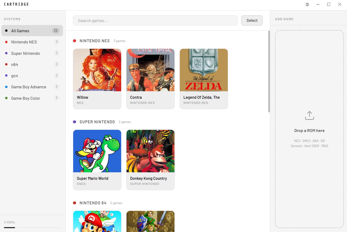 Box art scraping via SteamGridDB, save states for all EmulatorJS cores, drag-and-drop ROM import, keyboard remapping, and controller hot-plug support. As always, CARTRIDGE is 100% offline after install with all cores bundled.